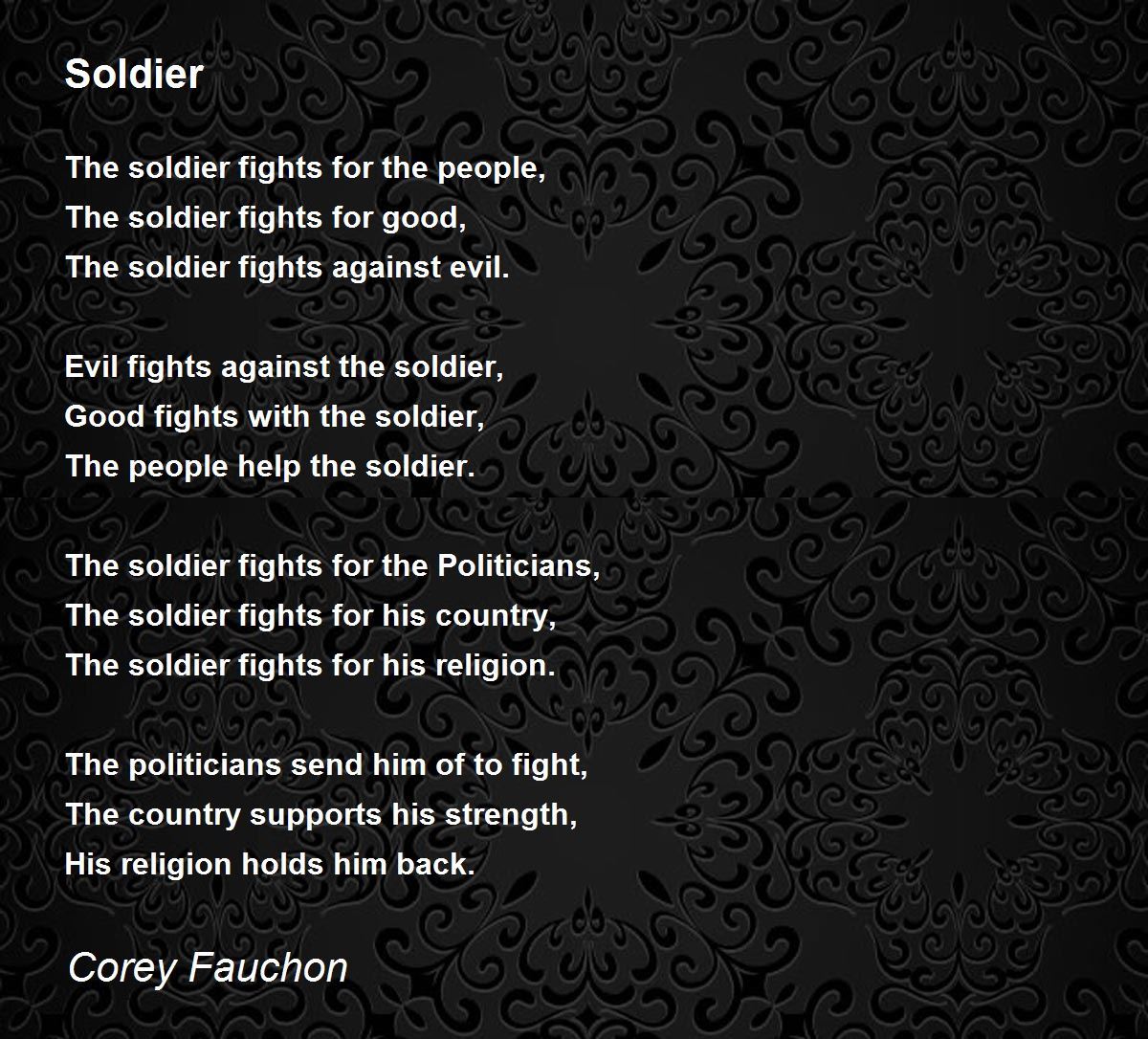 The soldier believes that with these atrocities neither bush nor blair deserve their freedom. The poem is the fifth of a series of poems entitled 1914. Throw it all away let's lose ourselves 'cause there's no one left for us to no i don't think you do there's no justice in the world there's no justice in the world and there. You can reach newest and popular soldier poems from this page.