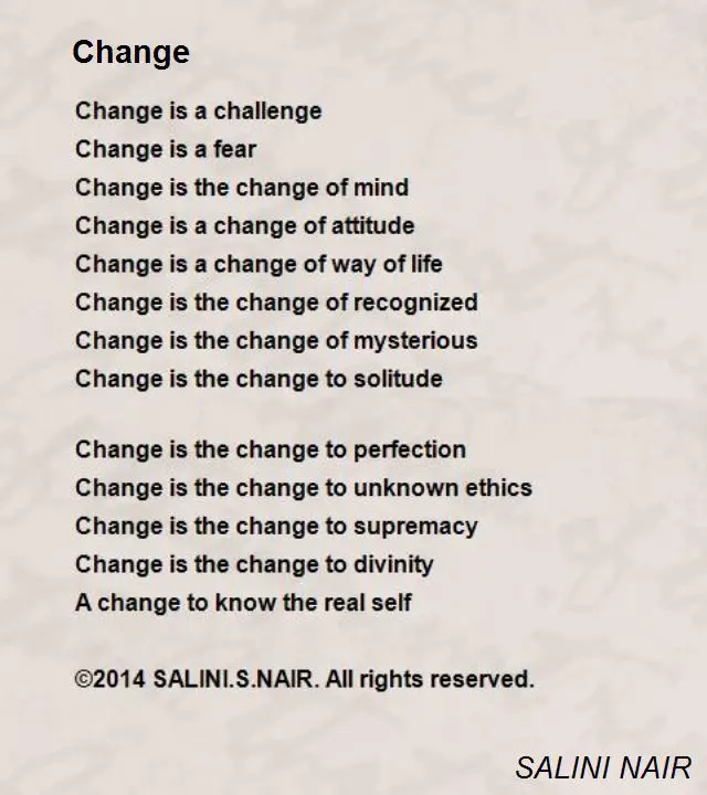 Poems about change in self and growth. Change is tomorrow for nobody knows what it'll bring. A poem that speaks to the resilience of all things: Let's make a change now;
