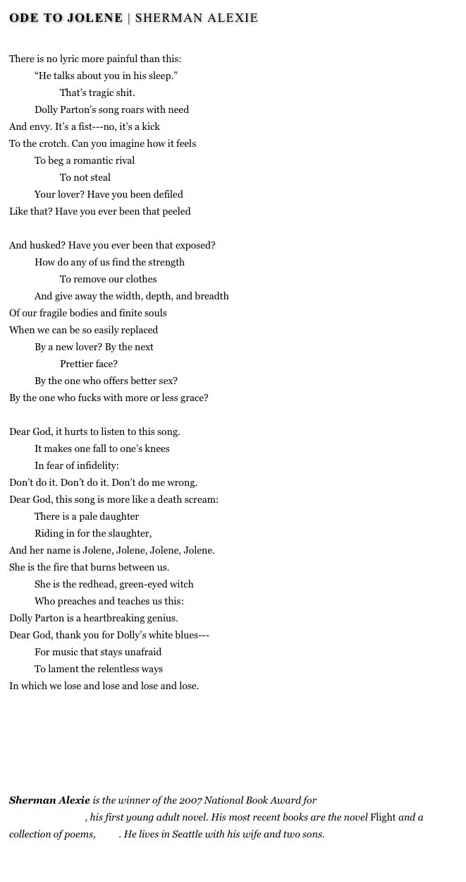 How much has poem analysis donated to charity? The author of over 20 books, sherman alexie is an acclaimed poet, novelist, filmmaker, and performer. Poems, quotations and biography on sherman alexie. An echo, asking a shadow to dance.