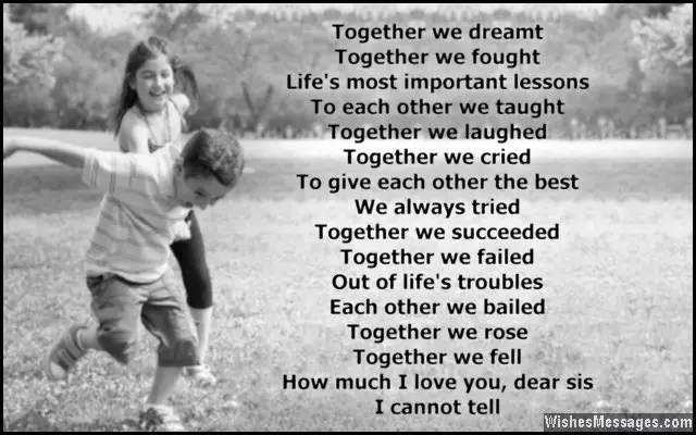 I can draw my sister english poems for children. 1 poem i don't know how to put this i have feelings for you can't you see i love you i cant live a day without you you have a special place in my heart you will always be part of my life 2poem everyday i think of you monday i pray for us to be together tuesday i wish. You made me eat up all my greens and wiped my nose when snotty. There's running and climbing and jumping and falling and laughing and crying and hugging and brawling and rolling and losing he was gathering his things, making last minute plans moving his belongings, saying goodbye to his friends.