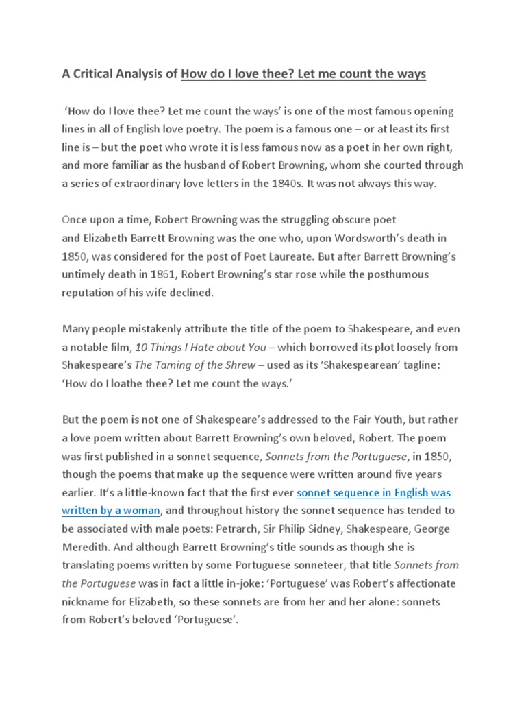 'how do i love thee' is a famous love poem and was first published in a collection, sonnets from the portuguese in 1850. Goodreads helps you keep track of books you want to read. The poem is a conventional petrarchan sonnet that lists the different ways in which the poet loves her husband. Read 84 reviews from the world's largest community for readers.