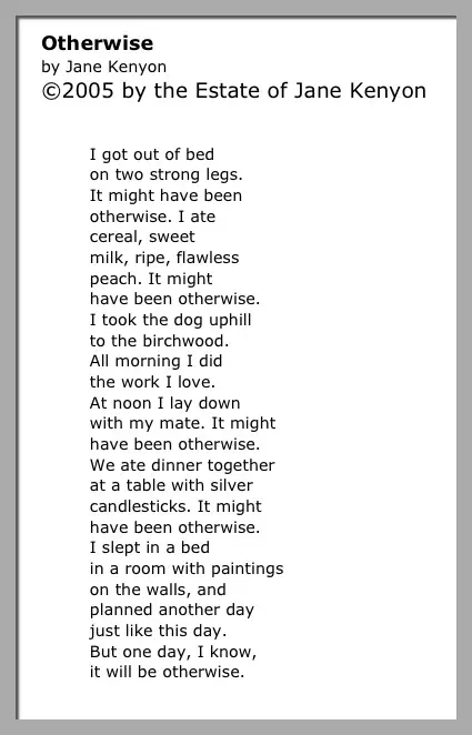 Get Jane Kenyon Poems Background. 'the poet's job is to put into words those feelings we all have that are so deep, so important, and yet so difficult to. It is no secret that jane kenyon suffered with bipolar disorder.